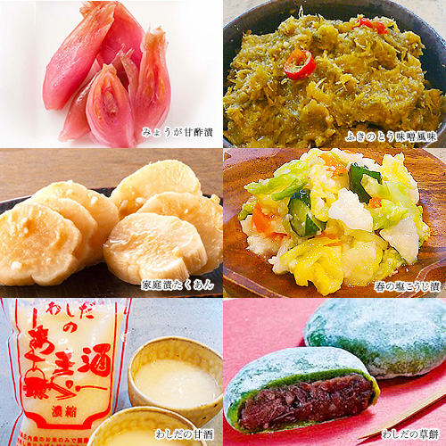 ふきのとう味噌(100g/1瓶)・家庭漬たくあん(200g/1袋)・春の塩こうじ漬(100g/1袋)・わしだの甘酒(300g/1袋)・みょうが甘酢漬(約150g/1袋)・草餅(4個)