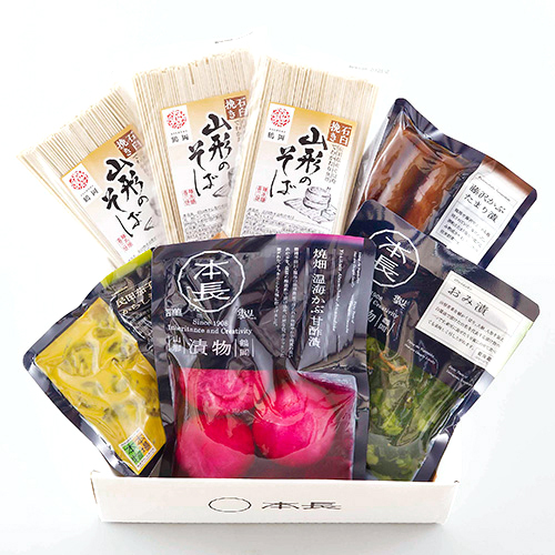 山形新そば200g×3袋、民田茄子からし漬×1袋、温海かぶ甘酢漬×1袋、近江漬×1袋、藤沢かぶたまり漬×1袋