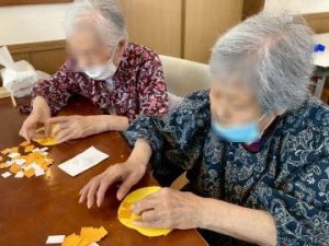 9月9日(火)デイサービスセンター結いのきの創作レクリエーションでは、濃淡2色の色紙を使って梨の貼り絵をしました。