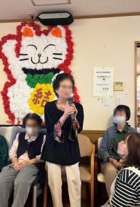 デイサービスセンター結いのきのレクリエーションの時間にYさんが『席上揮毫』を見せてくださいました。『席上揮毫』とは、多くの人の前で書道の制作過程を披露するパフォーマンスのことです。