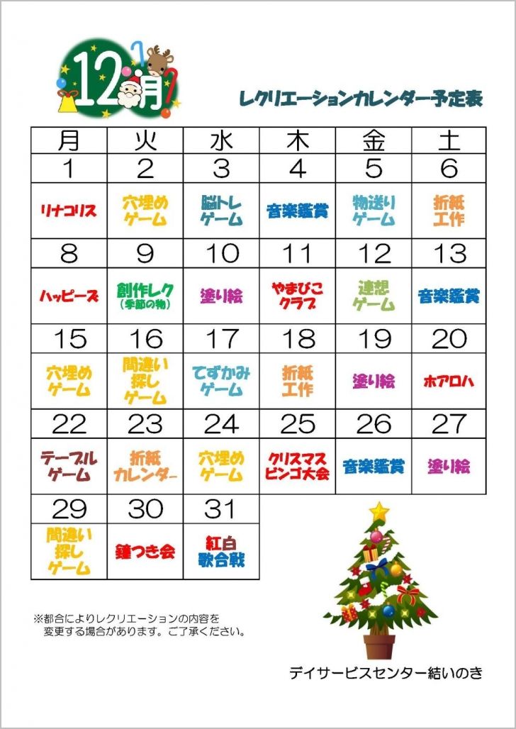 さて、デイサービスセンター結いのきの12月のレクリエーションカレンダーの発表です。