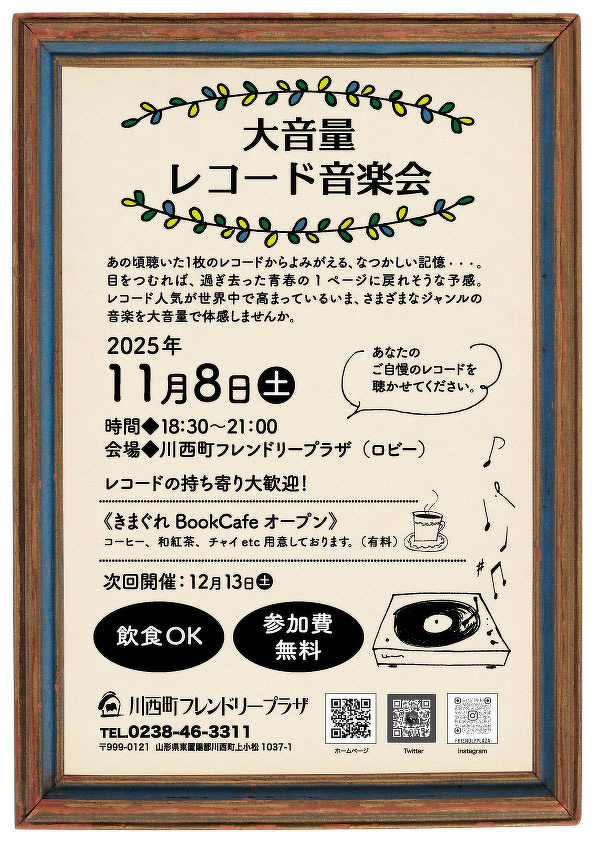 大音量 レコード音楽会 土曜の夜、ジャズからクラシック、歌謡曲までレコード音楽を楽しみませんか? ※飲み物持参OK※レコードの持ち込み大歓迎です 開催日時2025年11月8日(土)18:30〜21:00会場川西町フレンドリープラザ ロビー料金参加費無料 詳細は川西町フレンドリープラザ公式サイトをご覧ください。 Tweet 11月, 2025年開催, コンサート, 置賜地区