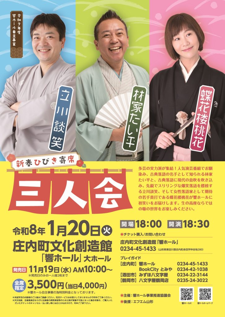 多芸の実力派が集結!人気演芸番組でお馴染み、古典落語の名手として知られる林家たい平と、古典落語に現代の息吹を吹き込み、先鋭でスリリングな爆笑落語を標榜する立川談笑、そして女性落語家として期待の若手真打である蝶花楼桃花が響ホールに初笑いをお届けします。