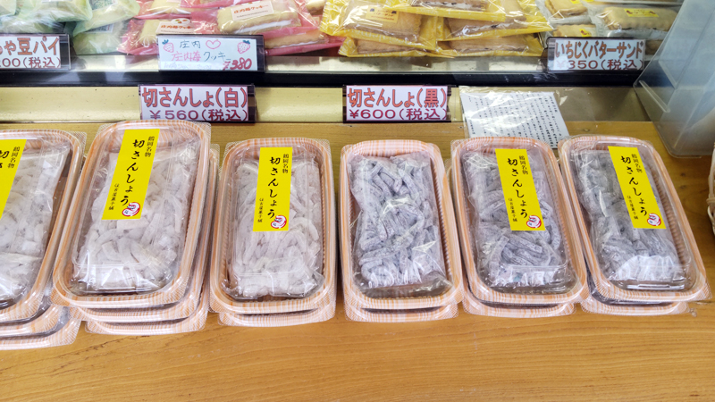 12月17日の観音堂の例祭「観音様のお歳夜」が近づくと、鶴岡市内のお菓子屋さんでは切さんしょう(「切さんしょ」とも言われます)作りが始まります。切さんしょうは、山椒の香りが効いた餅菓子です。そばとうどんの間ぐらいの太さで、短めに切ってあります。白砂糖と黒砂糖味の2つが定番となっています。